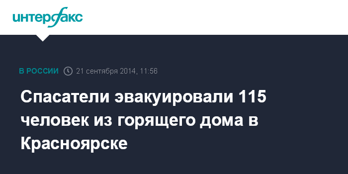 Москва. 21 сентября. INTERFAX.RU - Спасатели эвакуировали жителей горящего 25-этажного дома в Красноярске, сообщил "Интерфаксу" представитель пресс-службы ГУ МЧС России по Красноярскому краю Александр Якимов. "Эвакуация людей из дома завершена. Сколько именно людей выведено из горящего здания пока точно сказать не могу", - сказал он.