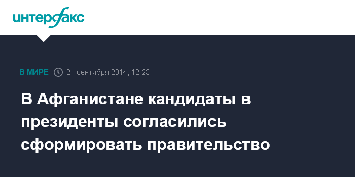 Москва. 21 сентября. INTERFAX.RU - Оба кандидата в президенты Афганистана Абдулла Абдулла и Ашраф Гани согласились вместе сформировать правительство национального единства, сообщает в воскресенье BBC.