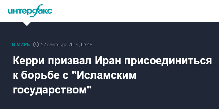 Москва. 22 сентября. INTERFAX.RU - Госсекретарь США Джон Керри на переговорах с главой МИД Ирана Джавадом Зарифом призвал иранскую сторону присоединиться к борьбе мирового сообщества против группировки "Исламское государство" (ИГ).