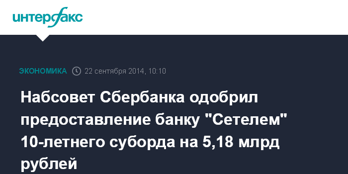 Москва. 22 сентября. INTERFAX.RU - Наблюдательный совет Сбербанка России 19 сентября одобрил сделку по предоставлению субординированного кредита банку "Сетелем" на сумму 5,18 млрд рублей сроком на 10 лет, говорится в сообщении Сбербанка.