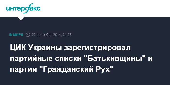Москва. 22 сентября. INTERFAX.RU - Центральная избирательная комиссия зарегистрировала списки кандидатов в народные депутаты от ВО "Батькивщина" и партии "Гражданский Рух" на внеочередных парламентских выборах.