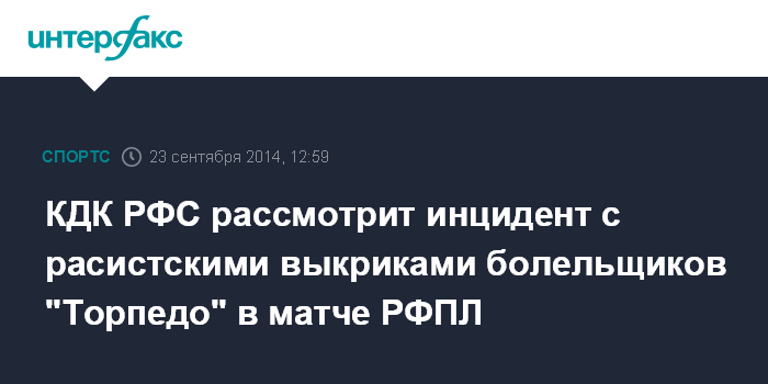 Москва. 23 сентября. INTERFAX.RU - Председатель Контрольно-дисциплинарного комитета Российского футбольного союза (КДК РФС) Артур Григорьянц сообщил, что в четверг на заседании комитета будет рассмотрен инцидент с уханьем болельщиков "Торпедо" в адрес защитника "Динамо" Кристофера Самба во время матча 8-го тура премьер-лиги (1:1).