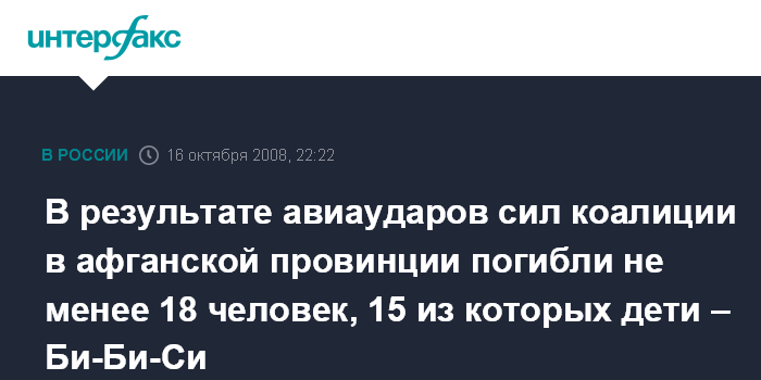 Лондон. 16 октября. ИНТЕРФАКС - Не менее 15 детей в возрасте от шести месяцев до 15 лет погибли в результате одного из авиаударов войск коалиции, нанесенного в афганской провинции Гильменд. Кроме того, в числе погибших и три взрослых женщины. Таковы свидетельства корреспондента британской телерадиокорпорации Би-Би-Си, который передает из столицы провинции Гильменд города Лашкарги.