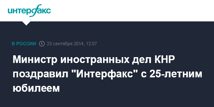 Министр иностранных дел КНР поздравил "Интерфакс" с 25-летним юбилеем