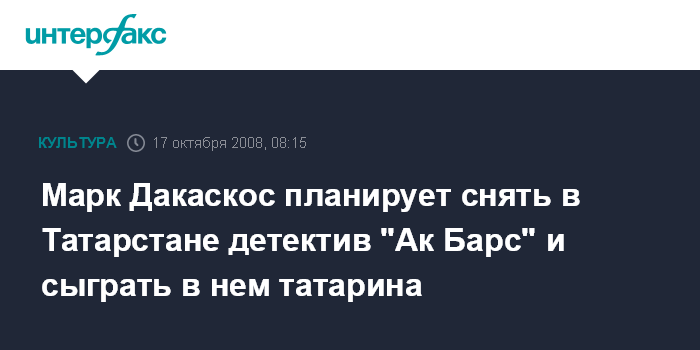 Москва. 17 октября. INTERFAX.RU - Известный американский актер Марк Дакаскос (Mark Dacascos) намерен снять в Казани фильм-детектив с рабочим названием "Ак Барс".