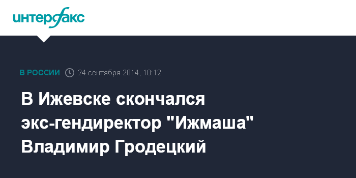 Москва. 24 сентября. INTERFAX.RU - В Ижевске в среду утром после тяжелой продолжительной болезни на 64-м году жизни скончался бывший генеральный директор завода "Ижмаш" Владимир Гродецкий, сообщил "Интерфаксу" его помощник.