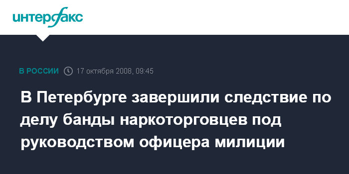 Москва. 17 октября. INTERFAX.RU - Следственными органами Следственного комитета при прокуратуре РФ по Петербургу завершено расследование уголовного дела против преступного сообщества, занимавшегося сбытом наркотиков, в основном на территории Василеостровского района и возглавлявшегося офицером милиции, сообщает отдел взаимодействия со СМИ СКП РФ.