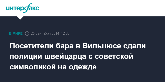 Москва. 25 сентября. INTERFAX.RU - В Вильнюсе вечером в среду был задержан гражданин Швейцарии, на одежде которого была советская символика, сообщил департамент полиции.