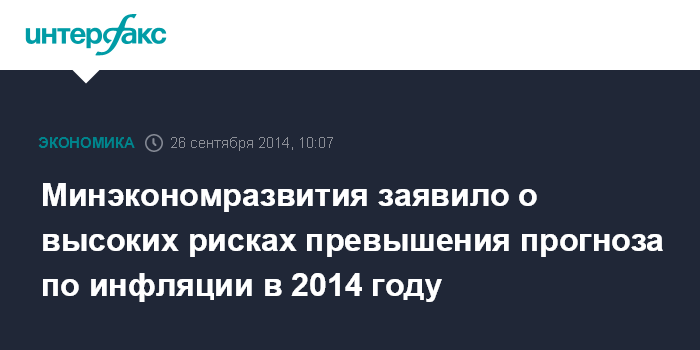 Москва. 26 сентября. INTERFAX.RU - Риски превышения прогноза по инфляции в России на 2014 год остаются высокими, говорится в окончательной версии прогноза социально-экономического развития РФ, опубликованной в понедельник на сайте Минэкономразвития.
