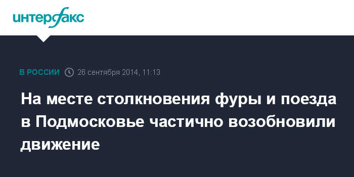 Москва. 26 сентября. INTERFAX.RU - Движение автотранспорта на 72-м км перегона станции "Михнево" Ступинского района Подмосковья, закрытое из-за столкновения электрички с фурой, частично восстановлено, сообщается в пятницу на сайте МЧС России по Московской области.