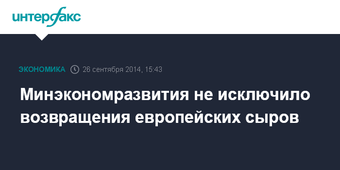 Москва. 26 сентября. INTERFAX.RU – Минэкономразвития России не исключает, что попавшие под российский запрет сыры и кисломолочная продукция могут вернуться на российский рынок в связи с тем, что безлактозная продукция выведена из санкционного списка.