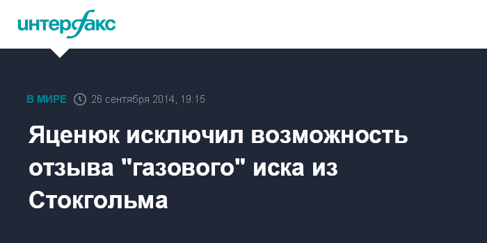 Москва. 26 сентября. INTERFAX.RU - Премьер-министр Украины Арсений Яценюк отказался комментировать итоги газовых переговоров между Украиной, ЕС и РФ, которые состоялись в пятницу в Берлине, но подчеркнул, что Киев не отзовет иск из Стокгольмского арбитража.