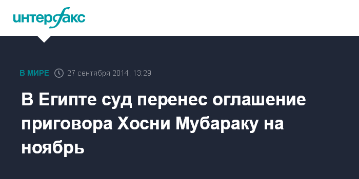 Москва. 27 сентября. INTERFAX.RU - Суд Каира в субботу перенес заседание, на котором планировалось огласить приговор в отношении бывшего президента Египта Хосни Мубарака на 29 ноября, сообщает агентство Associated Press.