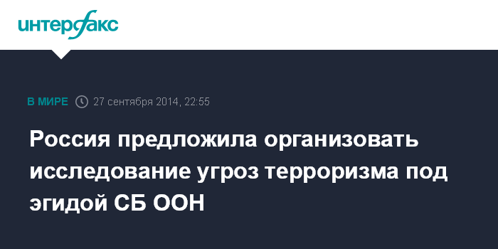 Москва. 27 сентября. INTERFAX.RU - Широкое исследование угроз терроризма необходимо провести под эгидой Совета безопасности ООН, заявляет глава МИД РФ Сергей Лавров.