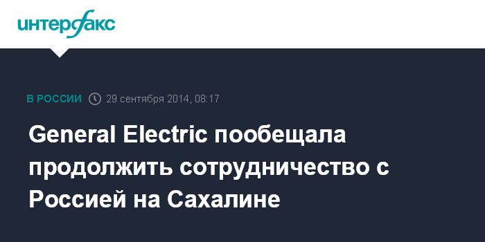 Москва. 29 сентября. INTERFAX.RU - Американская General Electric (GE), несмотря на введенные США санкции в отношении России, продолжит работу на Сахалине, заявил главный исполнительный директор международного бизнеса компании Джон Райс в понедельник на встрече с первым заместителем председателя правительства Сахалинской области Сергеем Шередекиным.