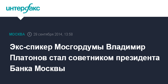Москва. 29 сентября. INTERFAX.RU - Бывший спикер Мосгордумы, депутат столичного парламента нового созыва Владимир Платонов приступил к исполнению обязанностей советника президента, председателя правления ОАО "Банк Москвы" Михаила Кузовлева.