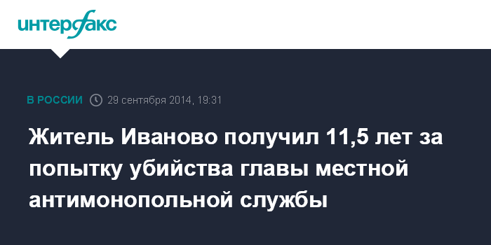 Москва. 29 сентября. INTERFAX.RU - В Иваново суд вынес приговор местному жителю за попытку убийства главы регионального управления Федеральной антимонопольной службы, сообщается на сайте Следственного комитета РФ.