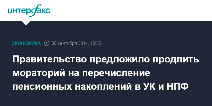 Москва. 30 сентября. INTERFAX.RU - Правительство РФ вносит в Госдуму законопроект о продлении на 2015 год моратория на перечисление пенсионных накоплений в управляющие компании (УК) и негосударственные пенсионные фонды (НПФ), сообщила пресс-служба правительства РФ.