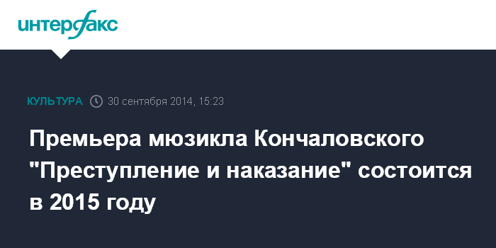 Москва. 30 сентября. INTERFAX.RU - В Московском театре мюзикла в 2015 году ожидается премьера музыкального спектакля по роману Федора Достоевского "Преступление и наказание" в постановке Андрей Кончаловского. Об этом журналистам сообщил художественный руководитель театра мюзикла Михаил Швыдкой.