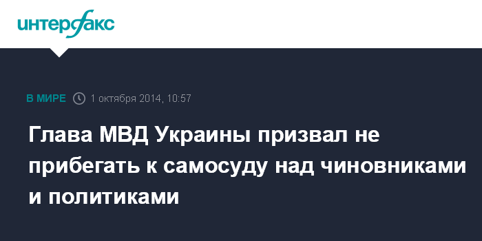Москва. 1 октября. INTERFAX.RU - Министр внутренних дел Украины Арсен Аваков призвал радикально настроенных украинцев воздержаться от неправомерных действий в отношении чиновников и политиков, поскольку такие инциденты не соответствуют цивилизованному статусу Украинского государства, которое стремится в Европу.