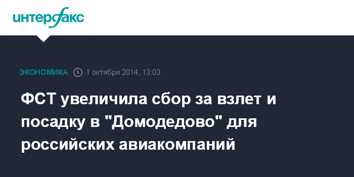 Москва. 1 октября. INTERFAX.RU - Правление Федеральной службы по тарифам (ФСТ) России приняло решение увеличить сбор за взлет-посадку для российских авиакомпаний в аэропорту "Домодедово" на 8%.