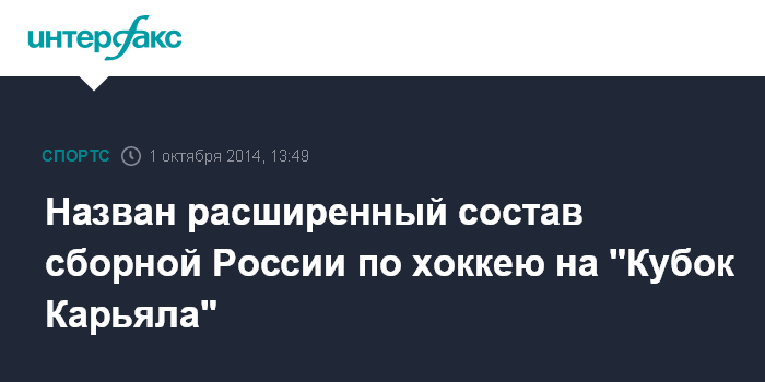 Москва. 1 октября. INTERFAX.RU - Тренерский штаб сборной России по хоккею назвал расширенный состав национальной команды на первый этап Еврохоккейтура-2014/15 - Кубок "Карьяла".