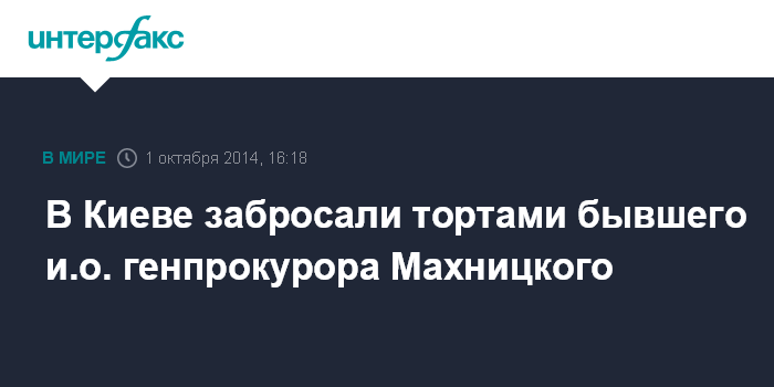 Москва. 1 октября. INTERFAX.RU - Неизвестные молодые люди бросили три торта в бывшего исполняющего обязанности генерального прокурора Украины Олега Махницкого, занимающего ныне должность советника президента Украины.