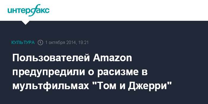 Москва. 1 октября. INTERFAX.RU - В мультфильмах из серии "Том и Джерри" могут содержаться сцены, отражающие этнические и расовые предрассудки. Такое предупреждение увидят абоненты стримингового сервиса Amazon Prime Instant Video, сообщает BBC News.