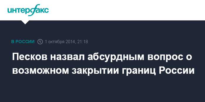 Москва. 1 октября. INTERFAX.RU - Пресс-секретарь президента РФ Дмитрий Песков назвал абсурдной постановку вопроса о возможном закрытии границ РФ.