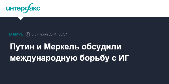 Москва. 2 октября. INTERFAX.RU - Президент России Владимир Путин и канцлер Германии Ангела Мерекель обсудили вопросы сотрудничества в деле противодействия группировке "Исламское государство" (ИГ), говорится в сообщении пресс-службы главы российского государства.