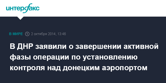 Москва. 2 октября. INTERFAX.RU - Ополченцы самопровозглашенной Донецкой народной республики заявляют о завершении активной фазы операции по установлению контроля над аэропортом Донецка.