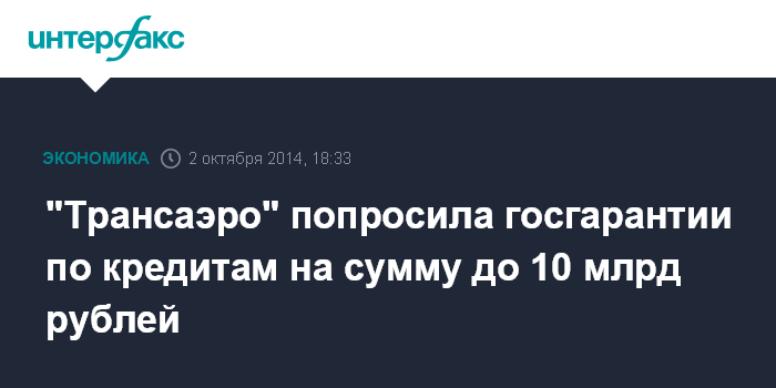 Москва. 2 октября. INTERFAX.RU - ОАО "АК Трансаэро" хочет получить госгарантии по привлекаемым кредитам в размере до 10 млрд рублей.