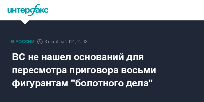 Москва. 3 октября. INTERFAX.RU - Верховный суд не нашел оснований для пересмотра приговора восьми фигурантам уголовного дела о беспорядках на Болотной площади 6 мая 2012 года в Москве. Как сообщается в пятницу на сайте ВС , защите Степана Зимина, одного из фигурантов дела, было отказано в передаче жалобы на приговор районного суда в кассационную инстанцию для рассмотрения.
