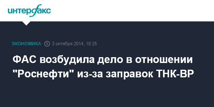 Москва. 3 октября. INTERFAX.RU - Федеральная антимонопольная служба (ФАС) приняла решение о возбуждении дела в отношении НК "Роснефть" из-за нарушения требований закона о защите конкуренции. Нарушение выразилось в неисполнении предписания ведомства, в частности, связанного с продажей автозаправочных станций (АЗС) после покупки ТНК-BP.