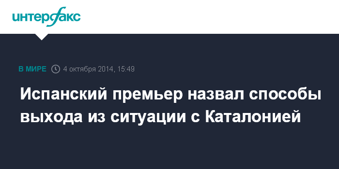 Москва. 4 октября. INTERFAX.RU - Премьер-министр Испании Мариано Рахой в субботу заявил, что диалог и закон должны лечь в основу решения ситуации с Каталонией. "Закон и диалог - вот способы выхода из ситуации с Каталонией, никто не может быть выше закона", - цитируют его испанские СМИ.