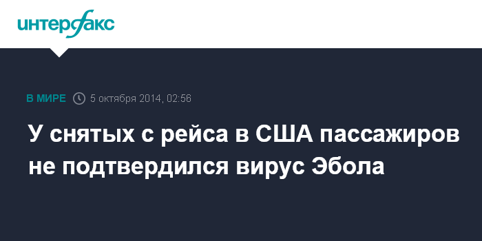 Москва. 5 октября. INTERFAX.RU - Медики не подтвердили диагноз у отца и дочери, снятых с рейса специалистами Центра по контролю и профилактике заболеваний (CDC) в аэропорту Ньюарк (штат Нью-Джерси). Об этом со ссылкой на официальные источники сообщает ABC News.