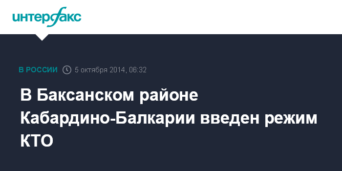 Москва. 5 октября. INTERFAX.RU - Режим контртеррористической операции введен на части территории Баксанского района Кабардино-Балкарии (КБР), сообщает в воскресенье оперативный штаб в КБР.