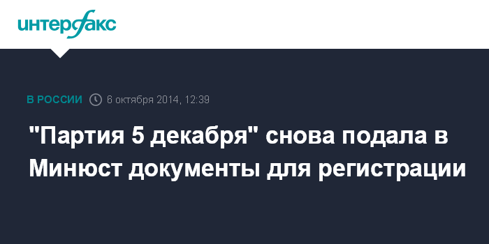 Москва. 6 октября. INTERFAX.RU - "Партия 5 декабря" в очередной раз подала документы на регистрацию в Минюсте, говорится в сообщении на сайте партии.