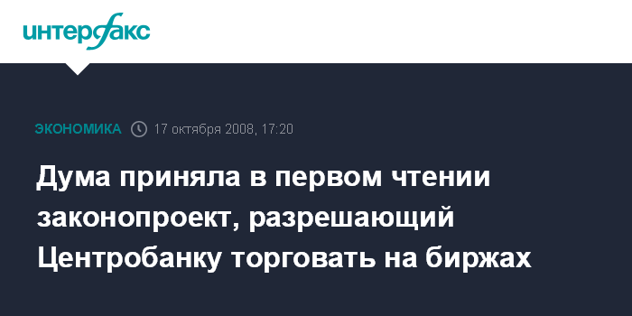 Москва. 17 октября. INTERFAX.RU - Госдума РФ на пленарном заседании в пятницу приняла в первом чтении законопроект, разрешающий Центробанку принимать участие на торгах фондовых бирж или иных организаторов торговли на рынке ценных бумаг.