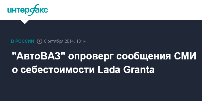 Москва. 6 октября. INTERFAX.RU - Компания "АвтоВАЗ" назвала несоответствующими действительности сообщения о себестоимости автомобиля Lada Granta, которая, по данным российских СМИ, составляет 55 тыс. рублей. Опровержение опубликовано на официальном сайте Lada.