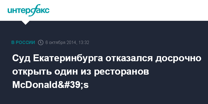 Москва. 6 октября. INTERFAX.RU - Ленинский районный суд Екатеринбурга на заседании в понедельник отклонил ходатайство компании McDonald's о досрочном открытии ресторана в центре города, деятельность которого была приостановлена на 85 суток.