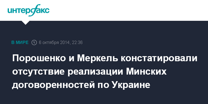 Москва. 6 октября. INTERFAX.RU - Президент Украины Петр Порошенко продолжил телефонные консультации с федеральным канцлером Германии Ангелой Меркель, в ходе которых обсудил нарушение ополченцами режима прекращения огня, а также отсутствие прогресса по восстановлению Киевом контроля над украинско-российской границей в Донбассе.