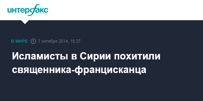 Москва. 7 октября. INTERFAX.RU - Боевики исламистской группировки "Фронт ан-Нусра" похитили священника францисканского ордена и еще нескольких христиан, говорится в распространенном во вторник заявлении ордена.