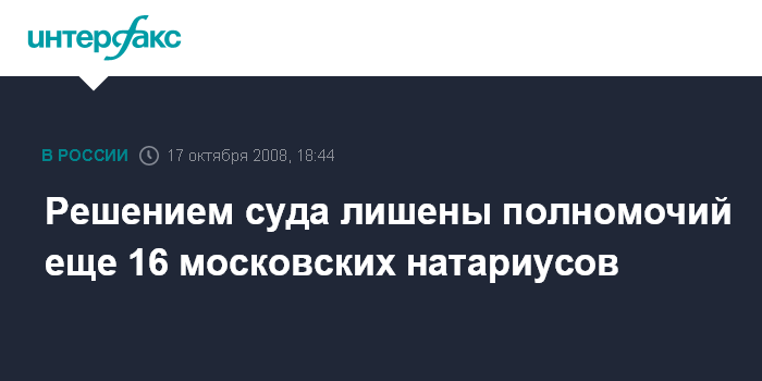 Москва. 17 октября. INTERFAX.RU - Симоновский суд Москвы лишил полномочий еще 16 столичных нотариусов, среди которых близкие родственники ряда столичных и федеральных чиновников.