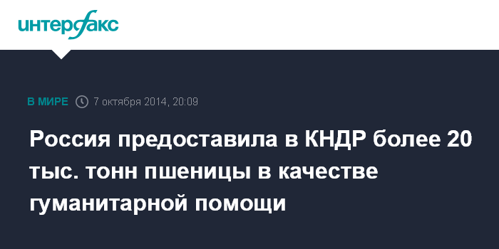 Москва. 7 октября. INTERFAX.RU - В КНДР морем доставлено более 20 тыс. тонн российской пшеницы в качестве гуманитарной помощи, сообщает во вторник МИД России.