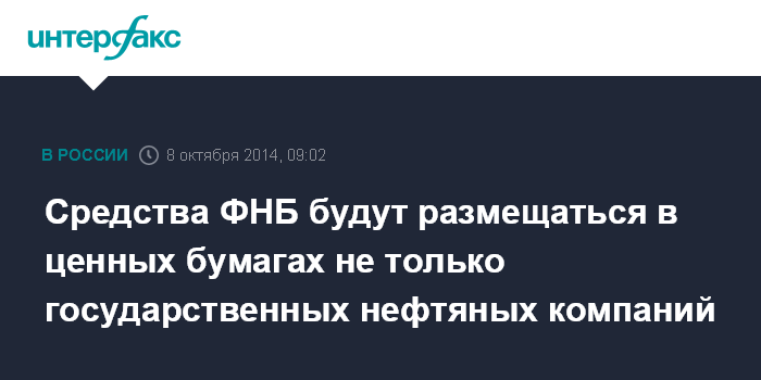 Москва. 8 октября. INTERFAX.RU - Средства ФНБ могут быть размещены в ценные бумаги не только государственных нефтяных компаний, заявил журналистам вице-премьер РФ Аркадий Дворкович.