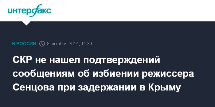 Москва. 8 октября. INTERFAX.RU - Следственный комитет РФ не нашел подтверждений тому, что украинский режиссер Олег Сенцов, обвиняемый в России в подготовке терактов, при задержании в Крыму был избит, сообщила защита режиссера.