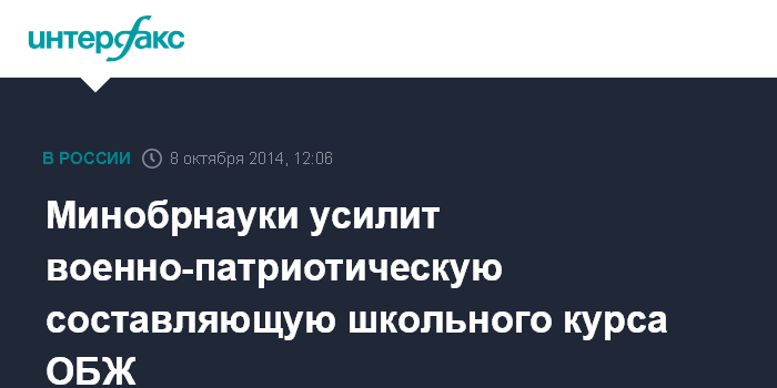 Москва. 8 октября. INTERFAX.RU - Минобрнауки РФ намерено усилить военную составляющую школьных уроков основ безопасности жизнедеятельности (ОБЖ), заявил глава министерства Дмитрий Ливанов.