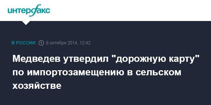 Москва. 8 октября. INTERFAX.RU - Премьер-министр РФ Дмитрий Медведев подписал распоряжение об утверждении "дорожной карты" по содействию импортозамещению в сельском хозяйстве.