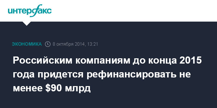 Москва. 8 октября. INTERFAX.RU - Из-за закрытия глобальных финансовых рынков российским компаниям до конца 2015 года придется рефинансировать не менее $90 млрд за счет внутренних источников, заявил глава Минэкономразвития Алексей Улюкаев, выступая на правительственном часе в Госдуме.